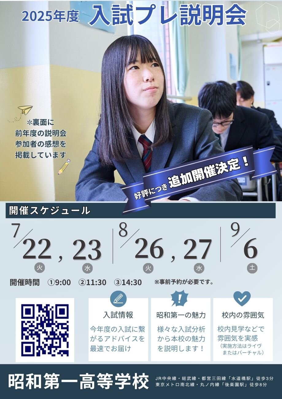 早期からの学校見学を希望する近年の受験生の傾向を鑑み、受験生・保護者の皆様が学校選択に求めるエッセンスをギュッと凝縮してお届けする90分。入試分析や学校選びの本音をわかりやすくお伝えして参ります。夏休み学校説明会とあわせて参加することが出来れば、昭和第一高校へのアプローチは万全だと思います。