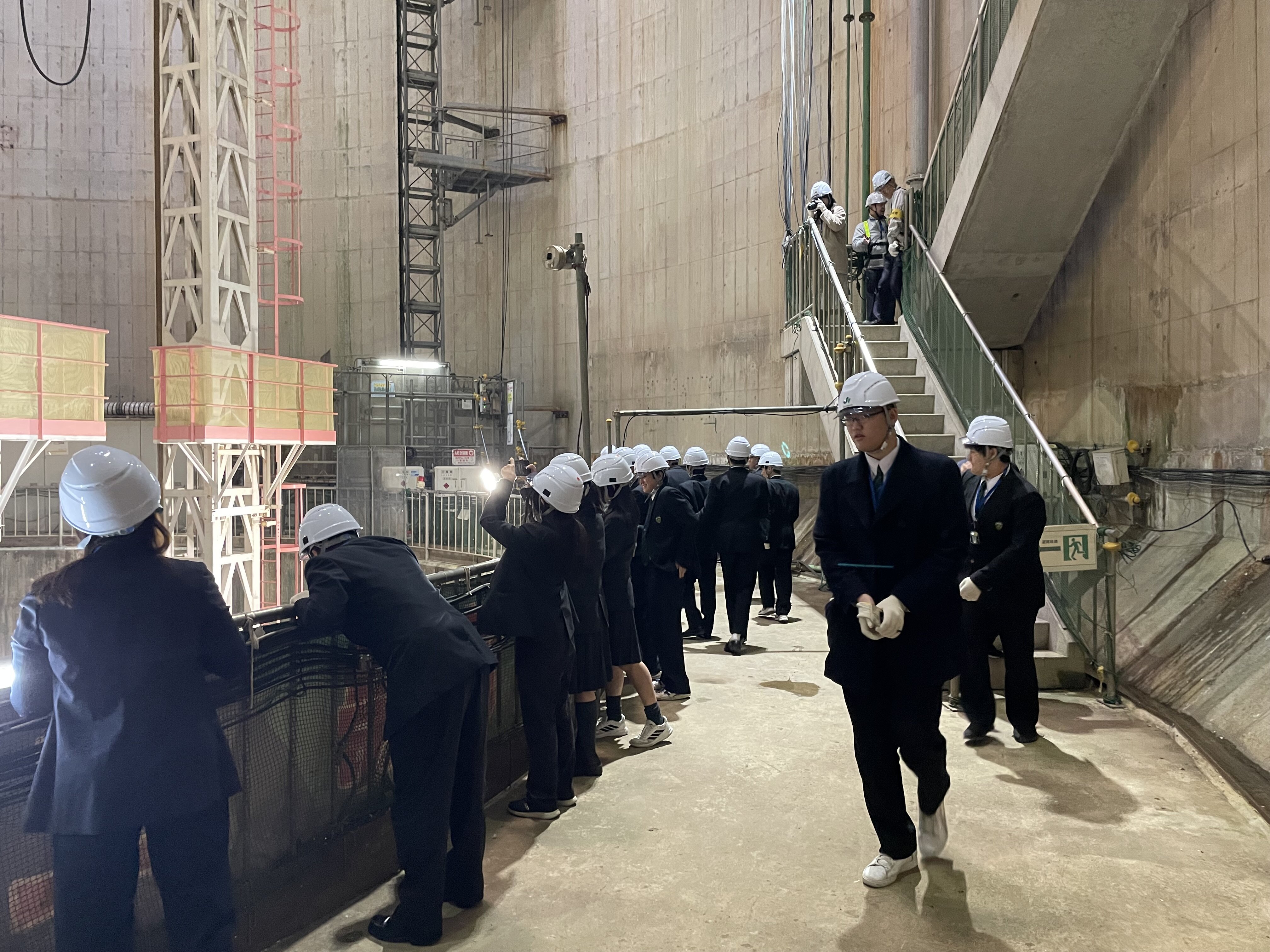 参加生徒・教員、皆ヘルメットと軍手を着用し、地下40mまで階段で下り見学へ行きました。